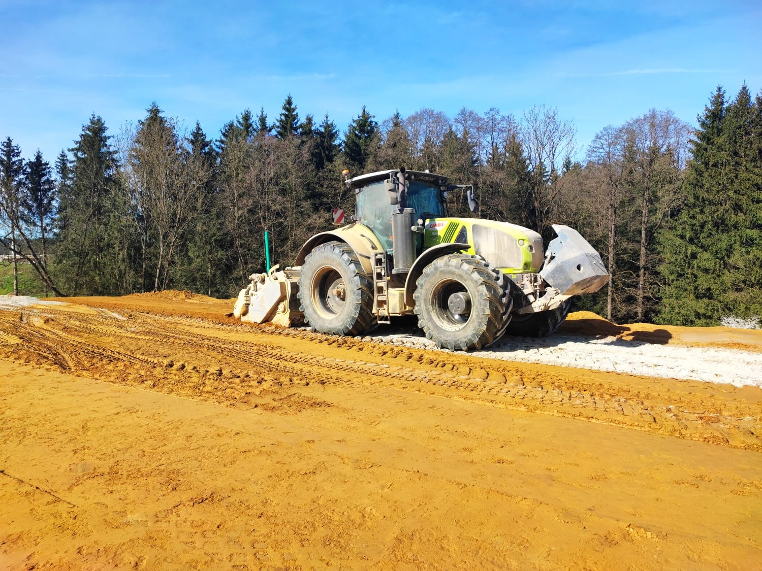 “Our Claas tractor and the STABI/H have been in use for a few days on a construction site south of Munich. The job consists of stabilizing clayey soil to a depth of 40 cm for a ring road in the area of Taufkirchen. We anticipate a total volume of 100,000 m³ of soil will be stabilized on this site”, continues Joachim.